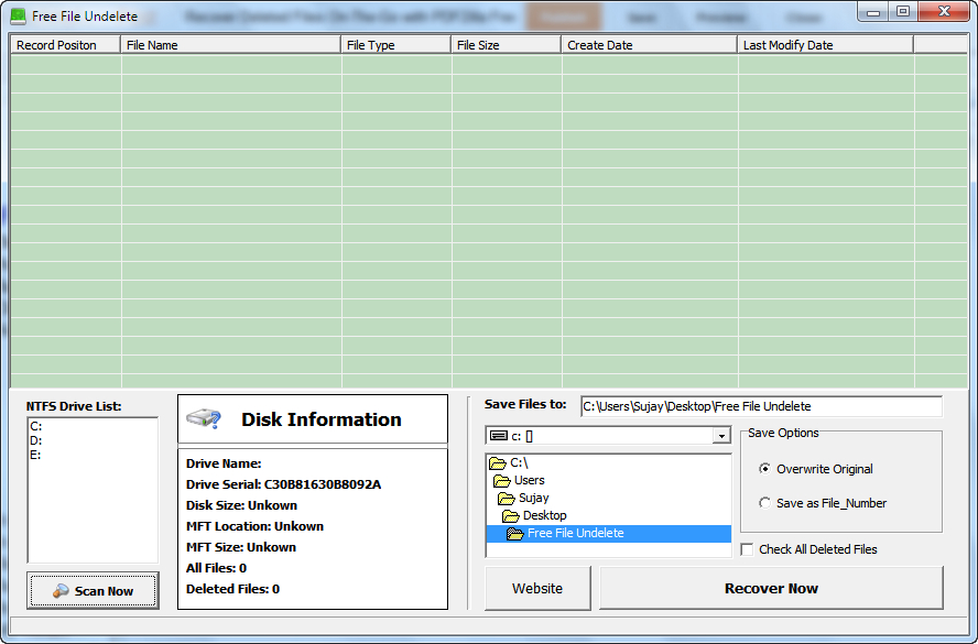 Free File Undelete is a tiny Windows file recovery application that allows users to undelete lost files from their NTFS drives. The program file size is 694KB only, and it is portable so that users can share it via email or flash disk very easily.