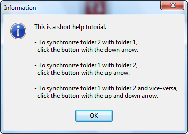 - The usage of the software is very basic. You just need to specify the paths of ‘Folder 1’ and ‘Folder 2’ and perform either one-way or both-way synchronization. it is described clearly in the quick help.