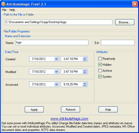 Few days back I wrote about XChange Attribute that was able to change attributes of a batch of files. Today I will discuss about AttributeMagic Free from Elwinsoft, a portable utility that can change attribute of both files and folders. Additionally it can change the Date and Time of Creation, Modification and Access of those file and folder and also can change the file name and extension.