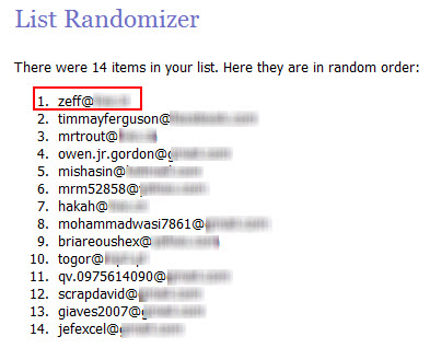 I failed to send one license to one of the email address. I will not wait for the problem to fix and so I have randomized the rest of the participants and have chosen the winner as the list topper.