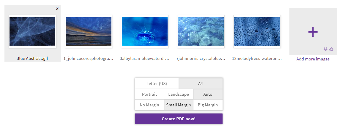 SmallPDF offers conversion of JPG as well as GIF, BMP, PNG and TIFF files to PDF. You can even choose mixed formats files in the same conversion process. After uploading the files, you can see the preview, and easily arrange the order of the files, or delete selected files. You will get option to change Page Size (Letter/A4), Orientation (Portrait/Landscape) and Margin (No/Small/Big). Interestingly, the previews are shown, and the arrangement options are available even before the files are completely uploaded.