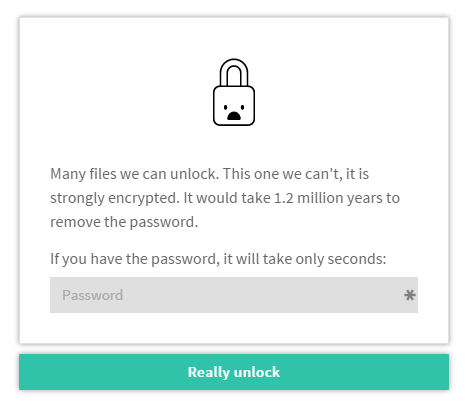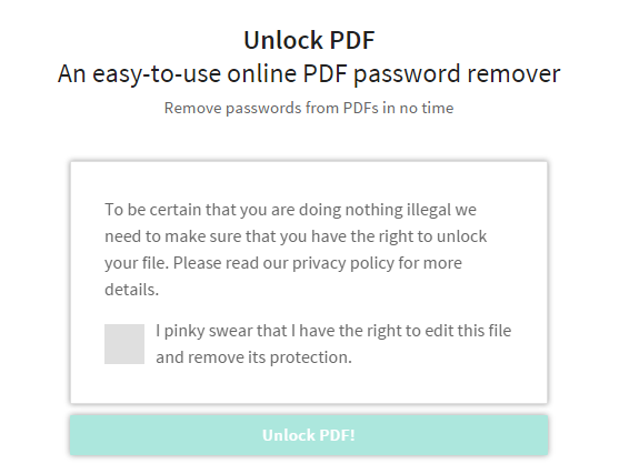 SmallPDF even allows you to unlock protected PDF files. After uploading the file, you should agree that you are allowed to unlock the file, and then the unlocking proceeds. If the file is password protected, it tries to remove it, but fails in most occasions, and then asks for the password. Non-password protected files can be unlocked with ease.